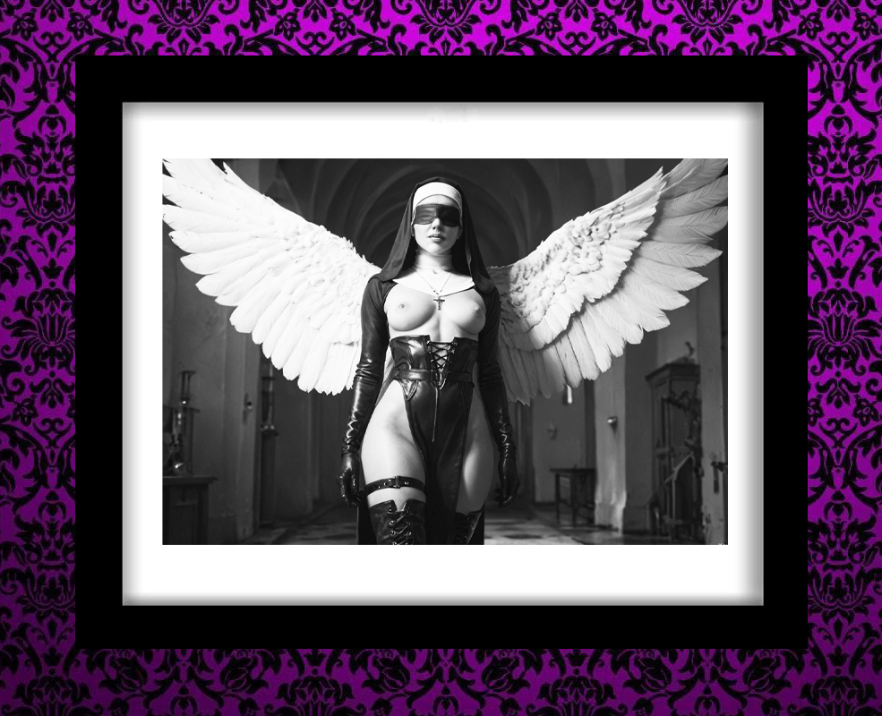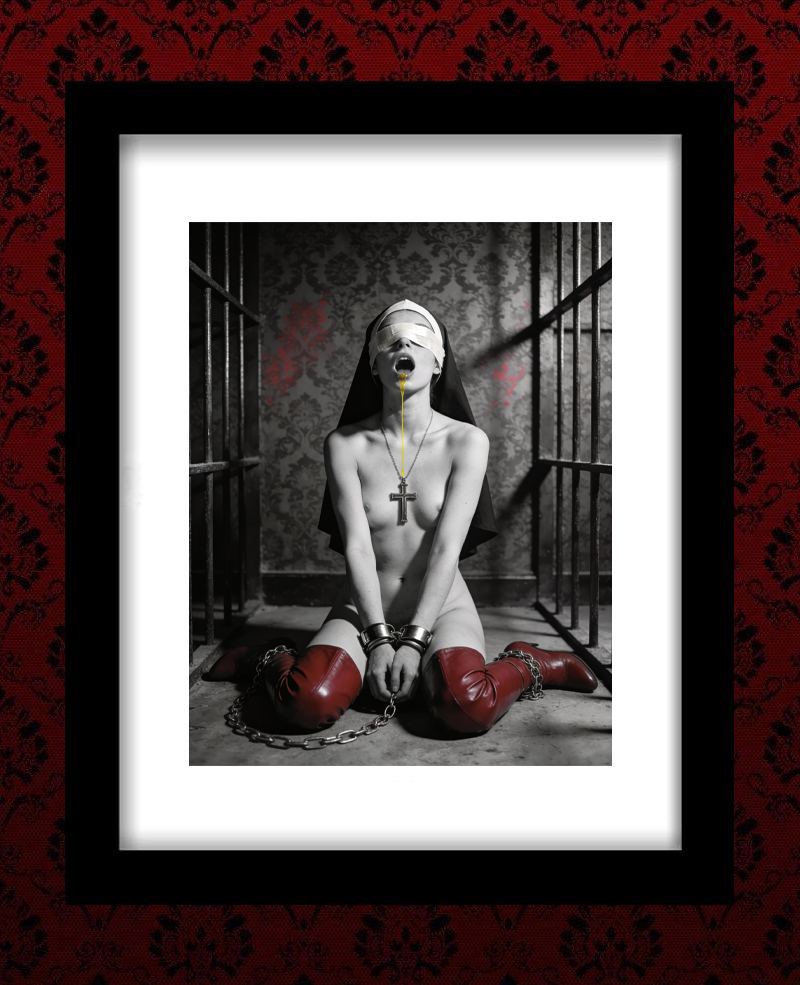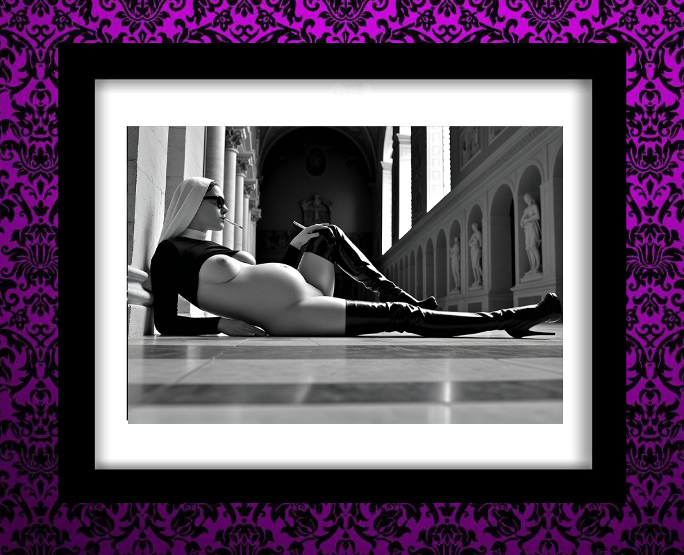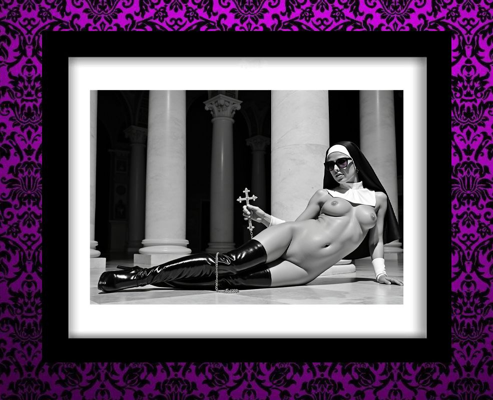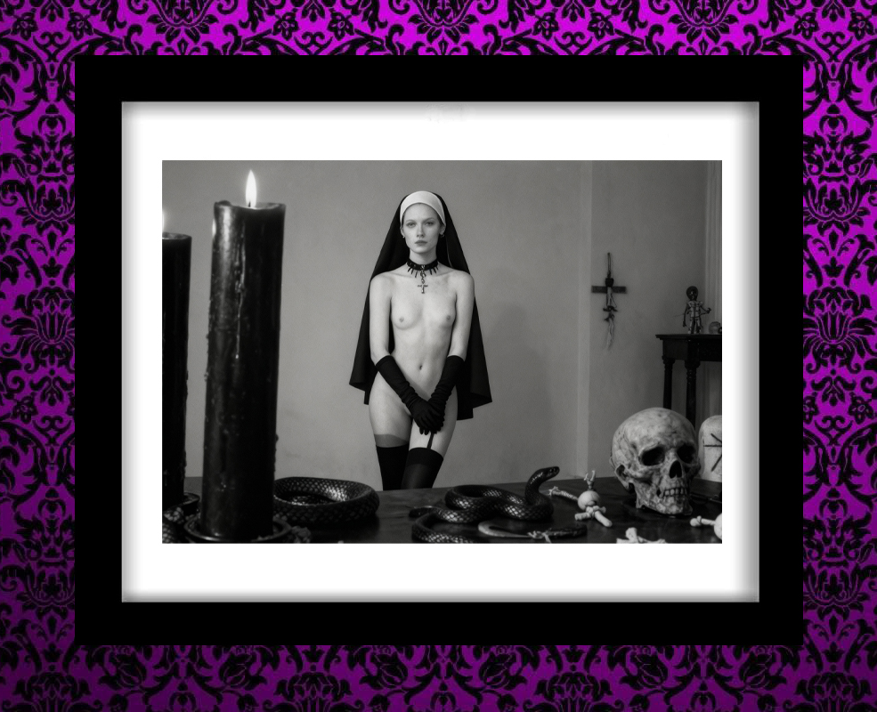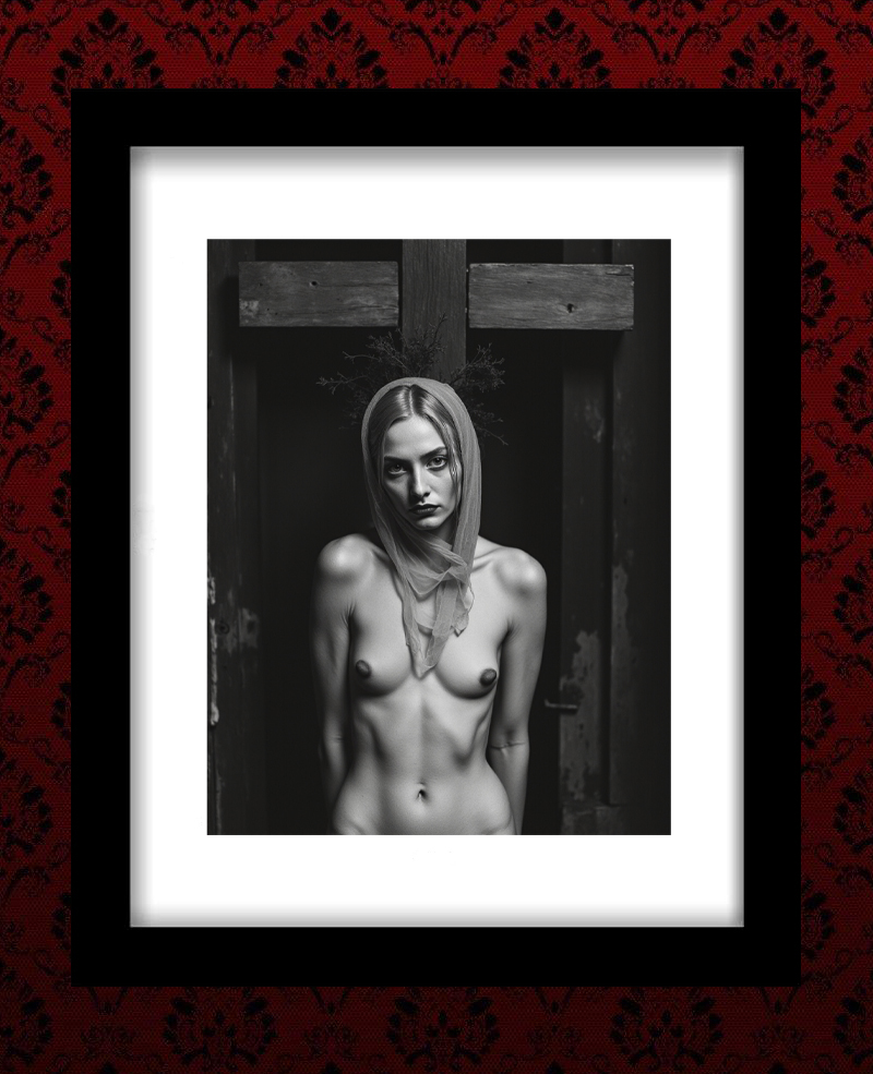 In the shadow of the pews, in the stillness of the night, 3am washed over her body, guiding her hands to secret places. Alas, a moment of release, for no one to see. Her nipples crossed out, to safeguard her vows.