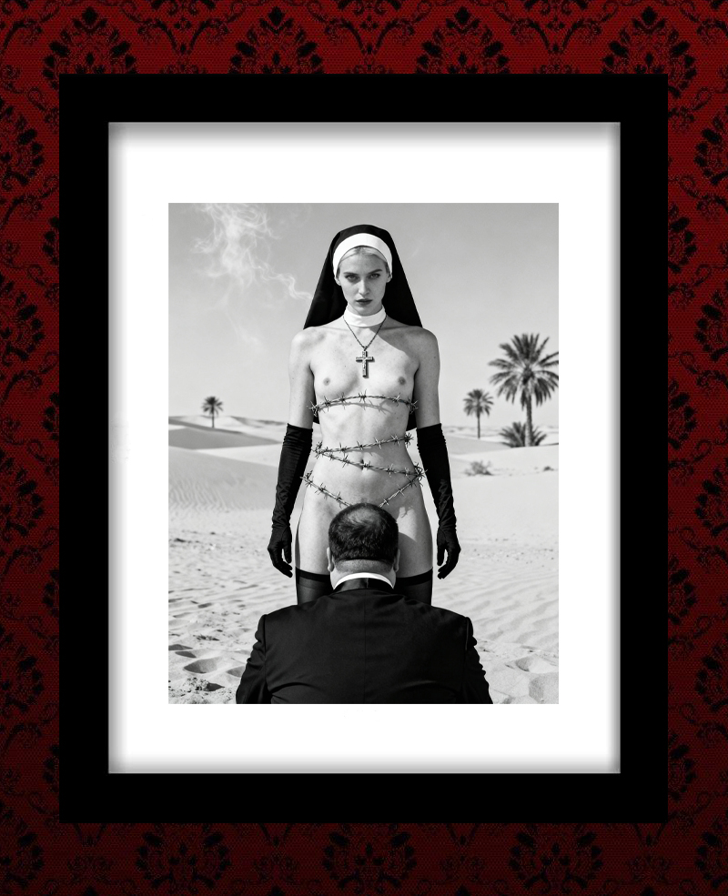 In the shadow of the pews, in the stillness of the night, 3am washed over her body, guiding her hands to secret places. Alas, a moment of release, for no one to see. Her nipples crossed out, to safeguard her vows.