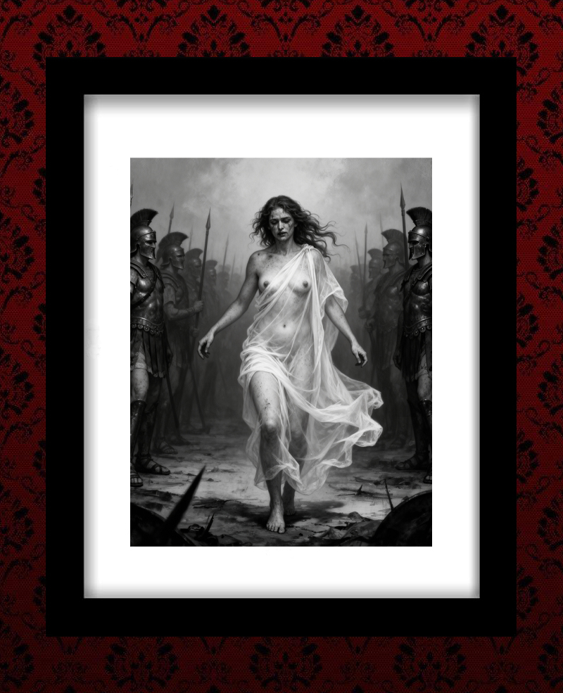 As her husband Leonidas met his fate at the hot gates of Thermopylae, the Spartan Queen Gorgo, walked amoung the lessor men of the city. Vying for their allegiance and hand. Some say she performed favor and danced in flesh to seal her seat. No man was immune to Gorgo's temptation. Even the Oracle surrender.